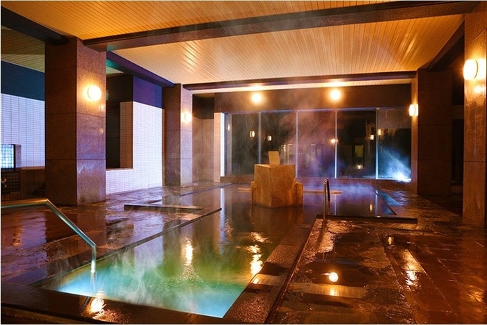 下段:なめらかな肌触りの黒湯が滔々と溢れる男性大浴場。