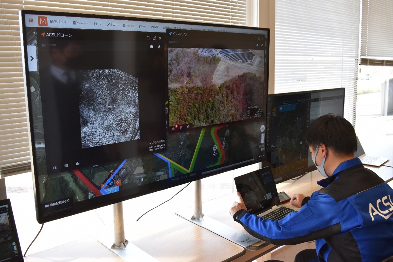映像確認は株式会社リアルグローブが開発したHec-Eyeを活用し、さらにフライトしている機体をACSL-PF2の撮影のため、もう1機(Inspire 2)をフライトさせております。両機の撮影映像はHec-Eyeにて配信し、シカ等鳥獣の生息状況もHec-Eyeのシステム上に記録しております。