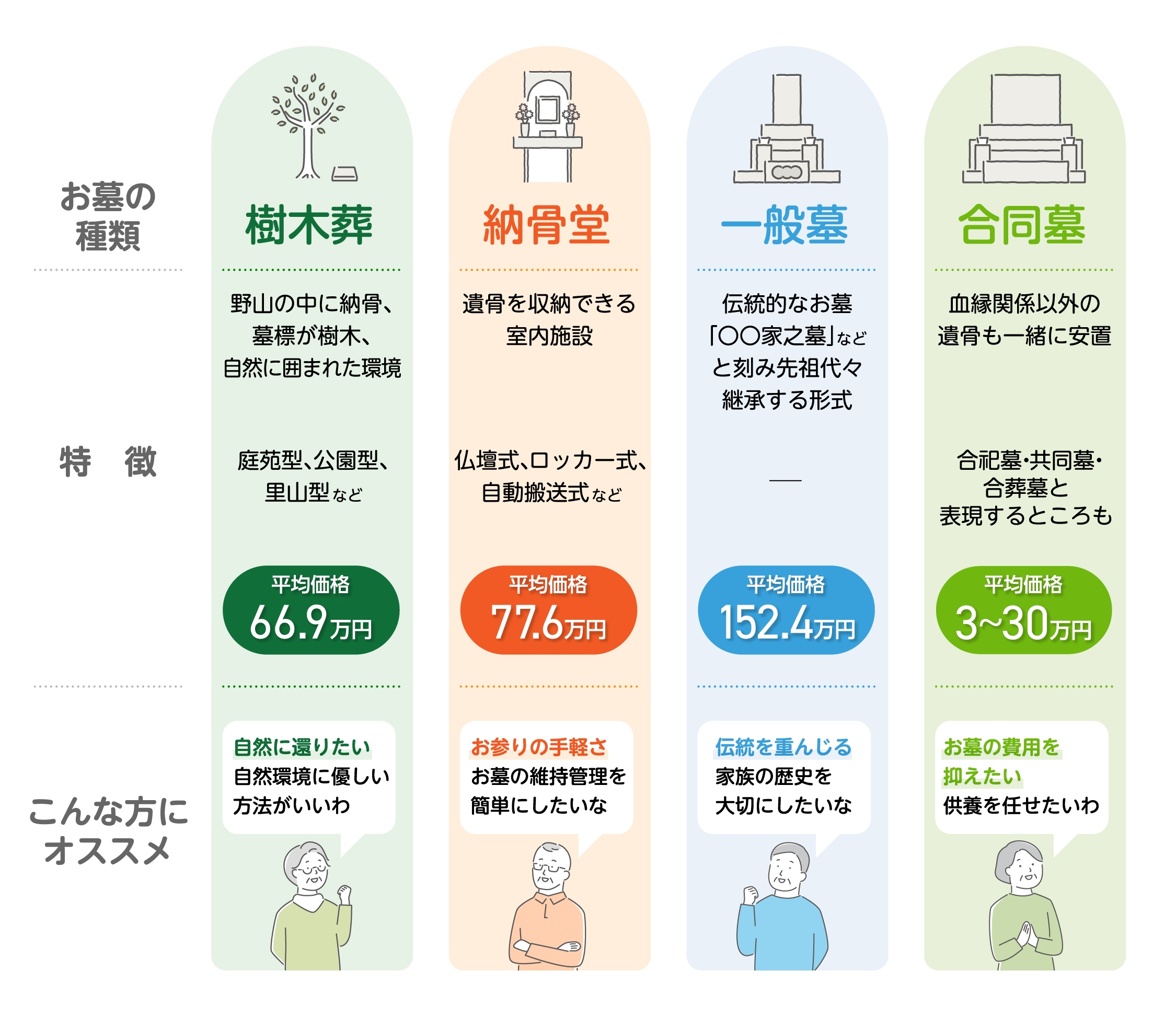 お墓は、伝統的なものから新しいものまで、大きく4つのタイプがあります。