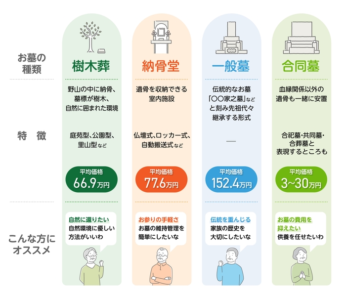 お墓選びは、私たちの人生で重要な決断のひとつです。かつてはお墓を「継ぐ」のが一般的でしたが、現代はお墓の形やスタイルが多様化し「選ぶ」が新たな常識となりつつあります。年末年始、家族が集まるこの特別な時期を利用して、家族みんなでお墓選びについて話し合い、共に未来を見据えることが大切です。ここでは、さまざまなお墓の特徴を紹介します。家族との会話のきっかけとして、お墓選びの参考にしていただければ幸いです。