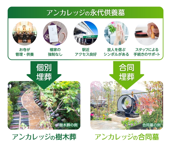 アンカレッジの永代供養墓(樹木葬・合同墓)は、お寺が永続的に管理をするので、後継ぎ・墓じまいが不要です。檀家の強制もありません。また、駅やバス停から徒歩圏内でアクセス良好なところが多いです。個別で埋葬され、そのシンボルがあるので、目の前で手を合わせ偲ぶことができます。