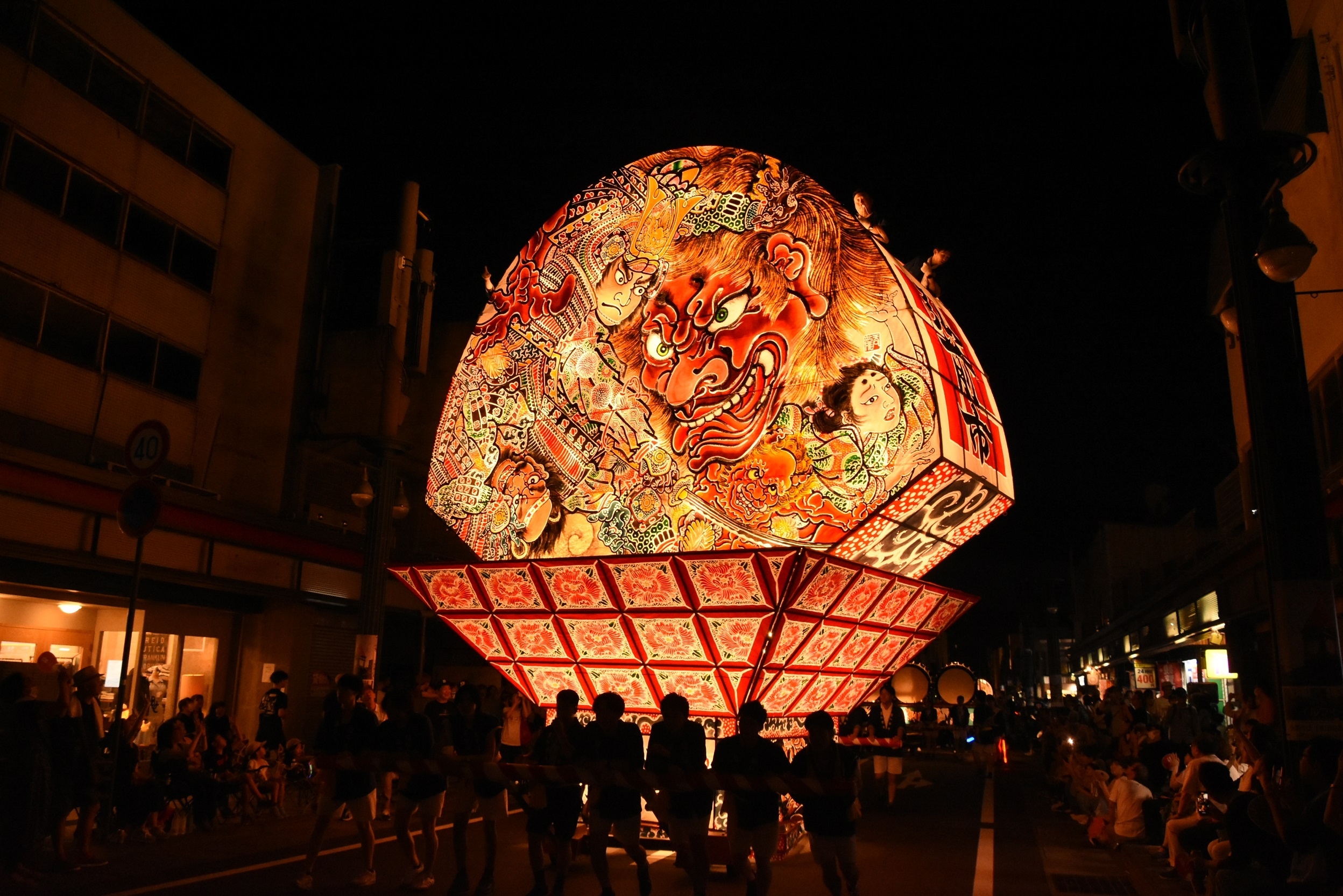 青森県津軽地方の夏を彩る「弘前ねぷたまつり」は、毎年8月1日~7日に開催され、三国志や水滸伝などの武者絵等を題材とした勇壮華麗なねぷたが城下町弘前市を練り歩く夏まつりで、国から重要無形民俗文化財に指定されています。「弘前ねぷたまつり」の始まりは、昔、農民が夏の忙しい時期に襲ってくる眠気を追い払うため、睡魔を船や燈(とう)籠(ろう)などにのせ、川に流した「ねむり流し」という行事から発展し、祭りになったとされています。