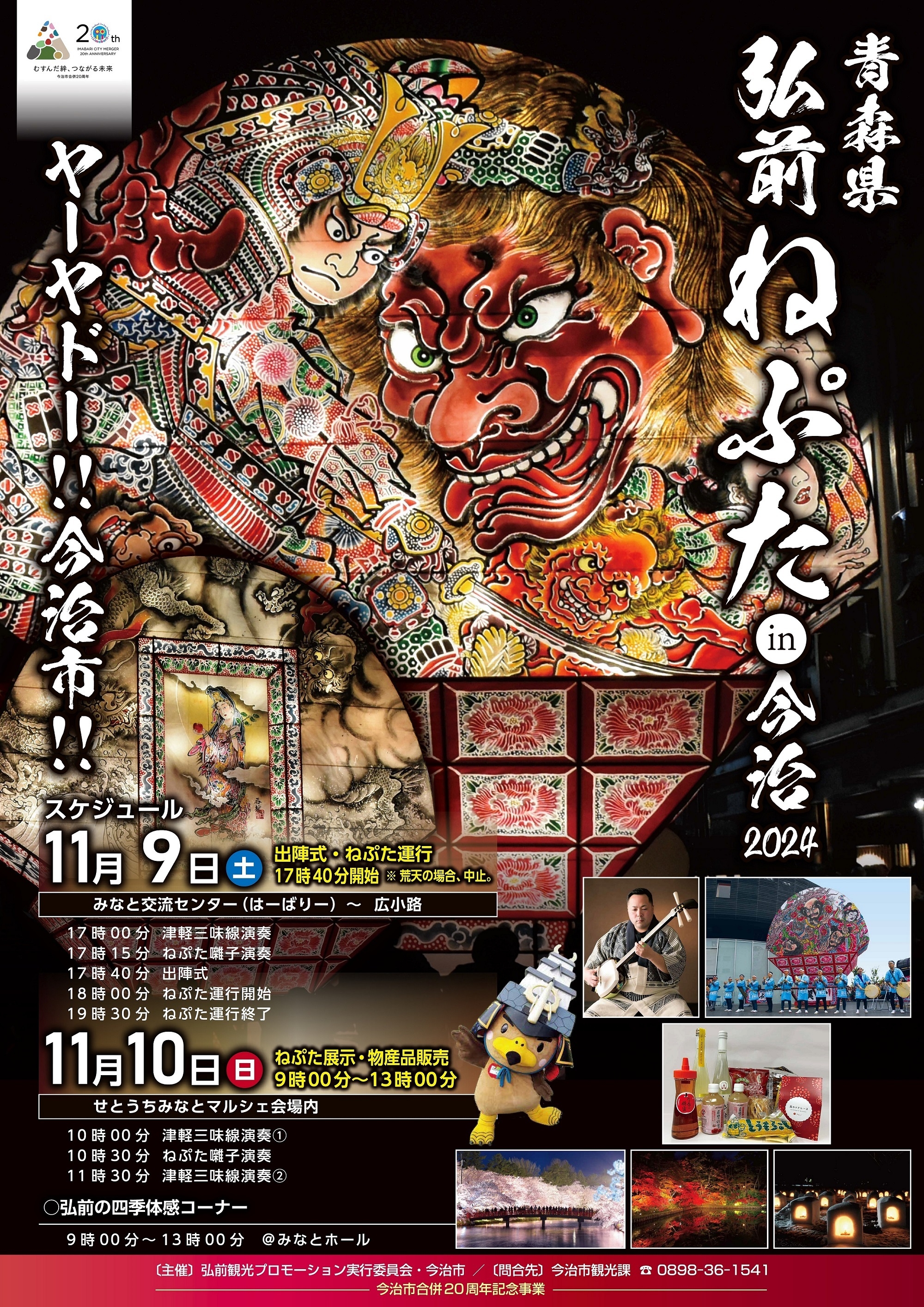 弘前観光プロモーション実行委員会では、四国及び山陽地方からの誘客促進を図るため、青森県弘前市の友好都市である群馬県太田市の姉妹都市である愛媛県今治市において、2024年11月9日から11月10日まで、今治市みなと交流センター「はーばりー」を中心に高さ約8m級の大型弘前ねぷたの運行や展示、物産販売などを行います。