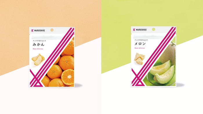 2021年7月1日に「お菓子のまるしげ」の新シリーズとしてチョコが染み込んだ「いちご」「りんご」「キウイ」、同年11月1日に「黒胡麻かりんとう」「一味あられ」「海老ごこち」を発売し、今回チョコが染み込んだ「みかん」と「メロン」が仲間入り。これら新シリーズは既にリピーターが増えており、今回チョコが染み込んだシリーズにさらに選ぶ楽しさがプラスされ今後が楽しみなシリーズです。