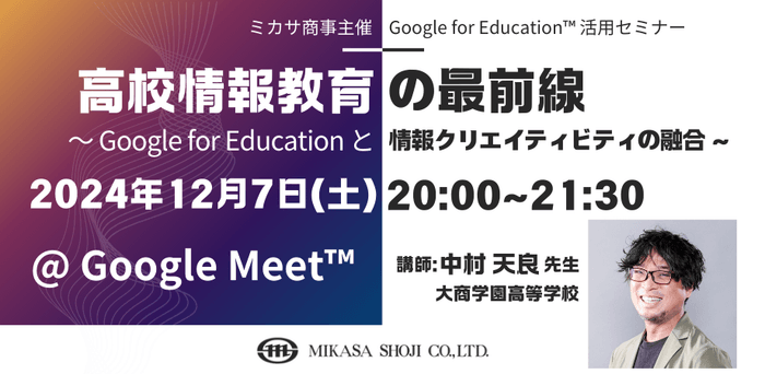 ミカサ商事株式会社(本社:大阪府、代表取締役:中西 日出喜、以下ミカサ商事)は、教職員向けICT活用セミナー「高校情報教育の最前線 〜 Google for Education と情報クリエイティビティの融合 〜」を、2024年12月7日(土)にオンライン開催いたします。