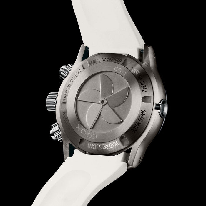 軽量チタン素材が腕への負荷を軽減しています。裏蓋に刻印された、パワーボートの動力であるスクリューモチーフのエングレービングによってできる凹凸が、腕との密着を防ぎ、快適な装着を可能にします。柔らかく腕馴染みの良い、耐久性に優れたシリコン配合のラバーストラップを、腕に沿った丸みのあるシルエットになるように、横方向ではなく下方向に取り付けています。