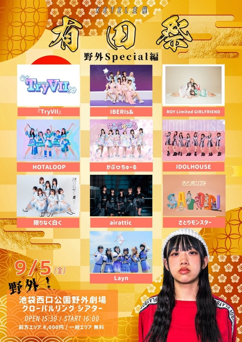 株式会社ケテル(本社:東京都渋谷区、代表取締役:丸本貴司・岩渕俊明/以下ケテル)は、所属アイドルグループLaynのメンバー有田珠莉がプロデュースする主催ライブ「有田祭vol.16〜野外Special編〜」を、2025年9月5日(金)に池袋西口公園野外劇場 グローバルリング シアターにて開催いたします。