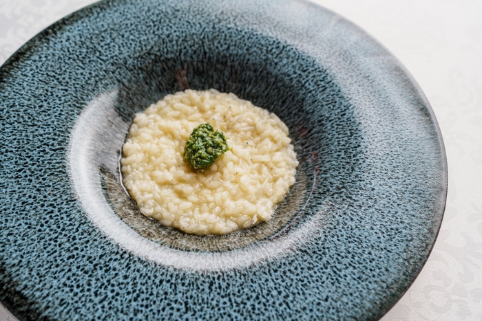 ・淡路海苔と淡路しらすのリゾット 春菊と芹のサルサヴェルデ添え