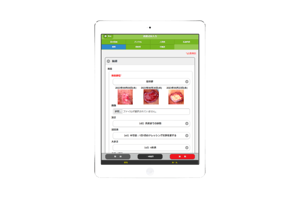 看護師が日々の訪問で対象者の褥瘡を発見すると、訪問記録時に褥瘡の状態(部位や大きさ・深さ、炎症などの程度)をはじめ、評価や処置などについて記録できるようになっており、同じ褥瘡の部位の過去履歴もわかるようになっています。