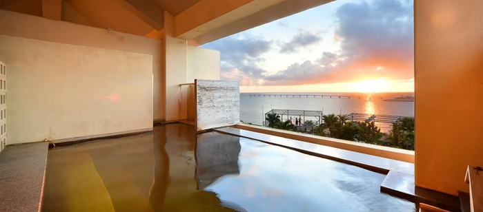地下1,000mから湧き出る天然温泉を贅沢に使用した大露天風呂の眺めは青々とした沖縄の空と海の雄大なロケーションが魅力!