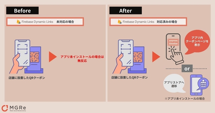 MGReがFirebase Dynamic Linksを導入したことにより、アプリ未インストールのユーザーがwebページ上で”アプリで続きを読む”などのボタンを押した際にはアプリストアへ移行し、アプリインストールを促すことが可能となります。また、実店舗にQRコード型のクーポンを設置した場合にも、上記同様、アプリ未インストールのユーザーはアプリストアへ誘導し、アプリインストール済みのユーザーにはアプリ内クーポンページがすぐに開く仕組みを実装します。これにより、クーポンの使用率アップも期待できます。