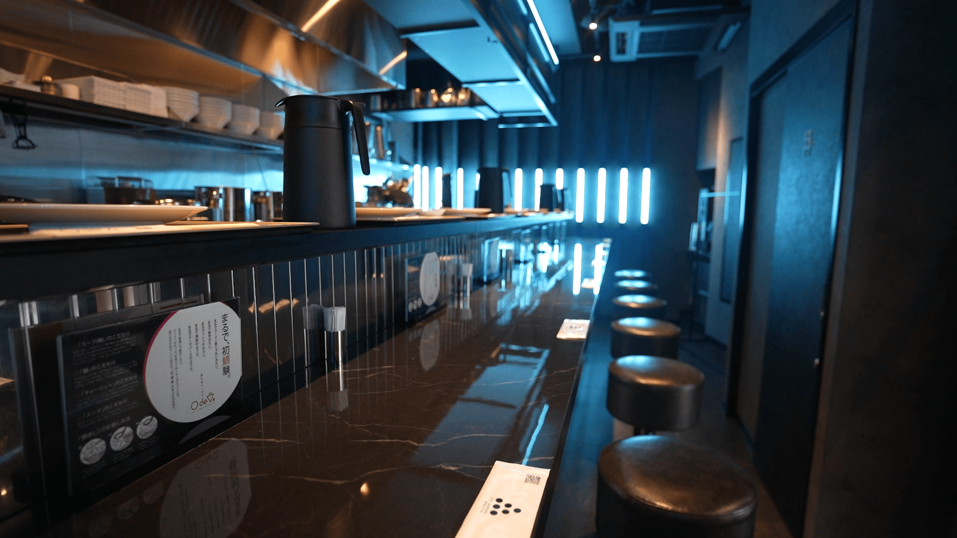 新大阪店では「まるでラーメン屋じゃないみたいなお店」をコンセプトに割烹料理店の様な店内の作り、BGM、座席の間隔、スタッフの所作すべてを「◯de▽らしさ」としてお客様をお迎えしてきました。