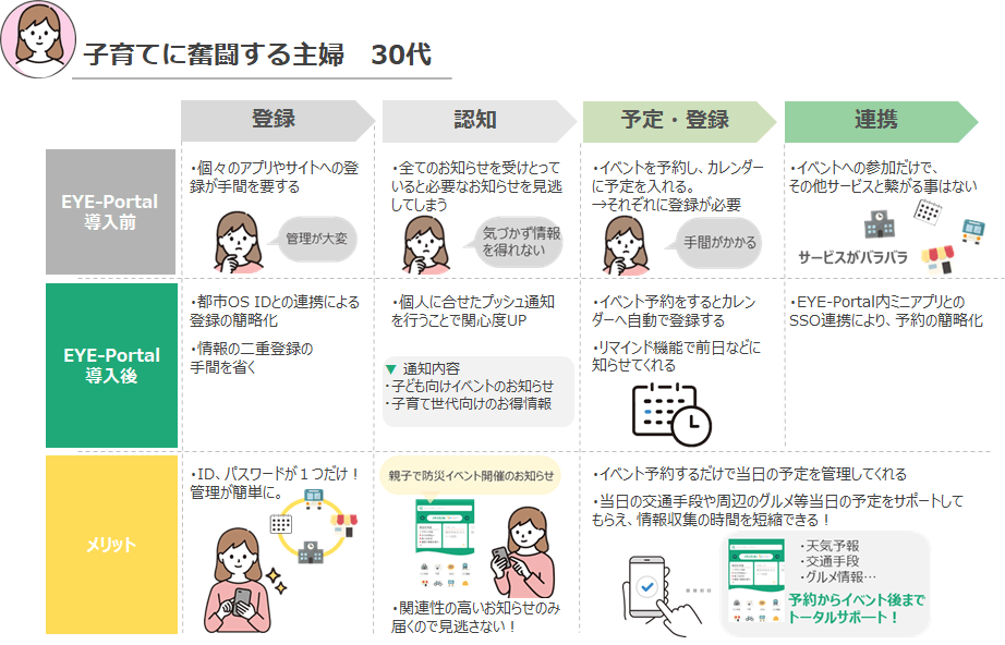 例えば、情報発信された地域のお祭りを生活者がカレンダーへ登録することで、行動予測から企業サービスへの連携につなげることが可能になります。これにより生活者の認知度向上や行動変容による地域経済への活性化を促進することで、持続的なスマートシティサービスを実現します。