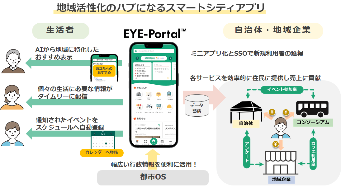 EYE-Portalは、様々なサービスを連携・融合し、一人ひとりの生活により密着したサービスを利用できる、生活者と自治体・地域企業のハブになるアプリです。