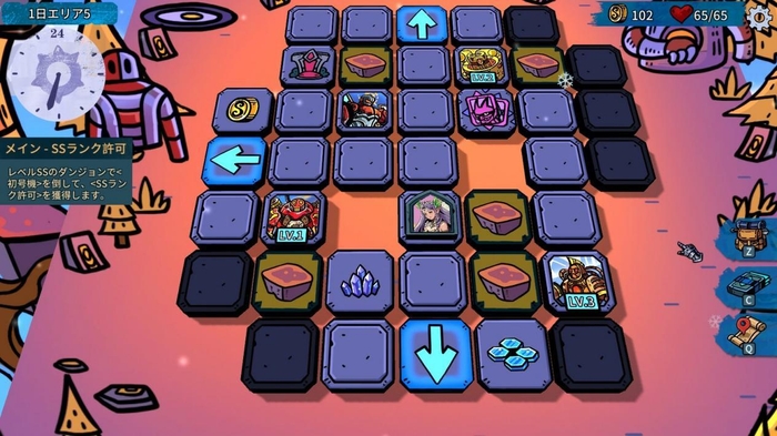 ・ゲームはチェス盤のようなマップ上で進行し、リソースを集めつつ、ランダムなイベントの選択を行い、絶え間なく変化する敵に立ち向かいます。