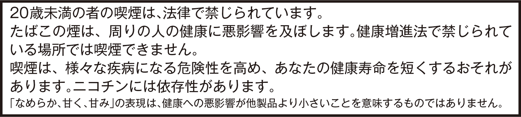 当社は、一般社団法人日本たばこ協会の自主基準に則り広報及び広告活動を行っておりますため、20歳未満の方へのたばこに関する情報発信はお控えいただきますようお願いいたします。また、本リリースを転載・転用いただく際には「健康注意文言」も併せて表示いただきますようお願い申し上げます。