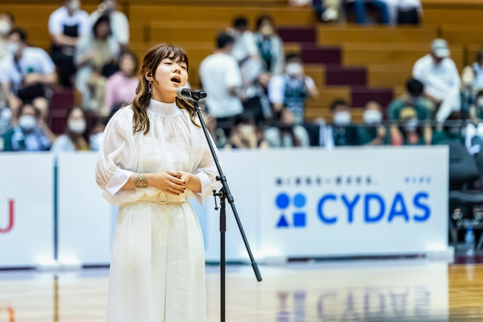 サイダス新卒1年目で、ハモネプなどの出場経験もある「きょーちゃん」こと野口響子が国歌斉唱と「私は最強」の歌唱で会場を盛り上げました。