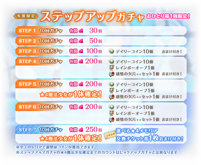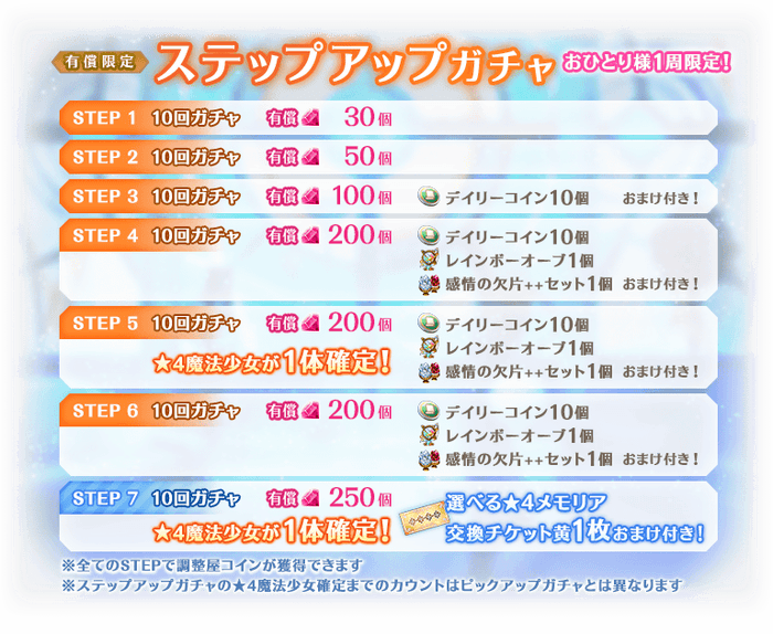 ※STEP5、STEP7での★4魔法少女について、ピックアップ対象の魔法少女が確定するわけではございません。
