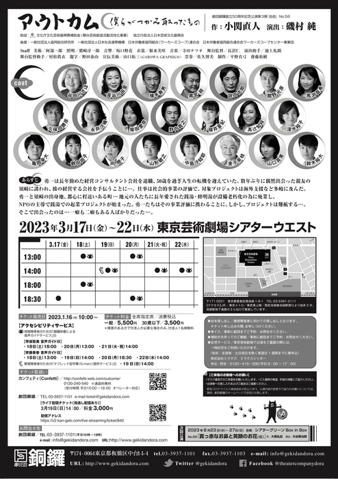 劇団銅鑼『アウトカム~僕らがつかみ取ったもの~』が2023年3月17日 (金) ~2023年3月22日 (水)に東京芸術劇場 シアターウエスト(東京都東京都豊島区西池袋1丁目8番1号 )にて上演されます。チケットはカンフェティ(運営:ロングランプランニング株式会社、東京都新宿区、代表取締役:榑松 大剛)にて1月16日(月)10:00より発売開始です。