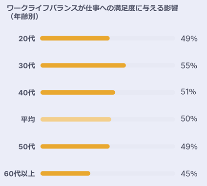 新型コロナウイルス感染症の拡大により人々が大きく関心を抱くようになったもう1つの要因が仕事と個人の生活を両立させる「ワークライフバランス」です。調査によると、回答者のうち10人に7人が「キャリアの成功よりも心の健康とワークライフバランスを優先する」と回答。また53%が「ウェルビーイングに悪影響を及ぼすような昇進は拒否する」と回答。日本の人材にとって、性別や年齢を問わず、ワークライフバランスやフレキシビリティは譲れないものであると同時に働くすべての人が企業に対して当たり前に期待する要因となりました。