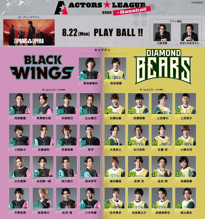 そして今年も俳優・黒羽麻璃央がプロデュースする『ACTORS☆LEAGUE in Baseball 2022』を8/22(月)東京ドームにて開催!黒羽がキャプテンを務める【BLACK WINGS】と和田琢磨がキャプテンを務める【DIAMOND BEARS】の各チームには昨年に続いて多くのメンバーが出場。さらに今年の新メンバーとしてBWチームに丘山晴己、立石俊樹、永田聖一朗、DBチームに富田 翔、松島勇之介という野球をこよなく愛する舞台俳優が選抜されました!