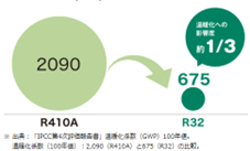 ※2 出展:「IPCC第4次評価報告書」温暖化係数(GWP)。温暖化係数2,090(R410A)と675(HFC-32)の比較。