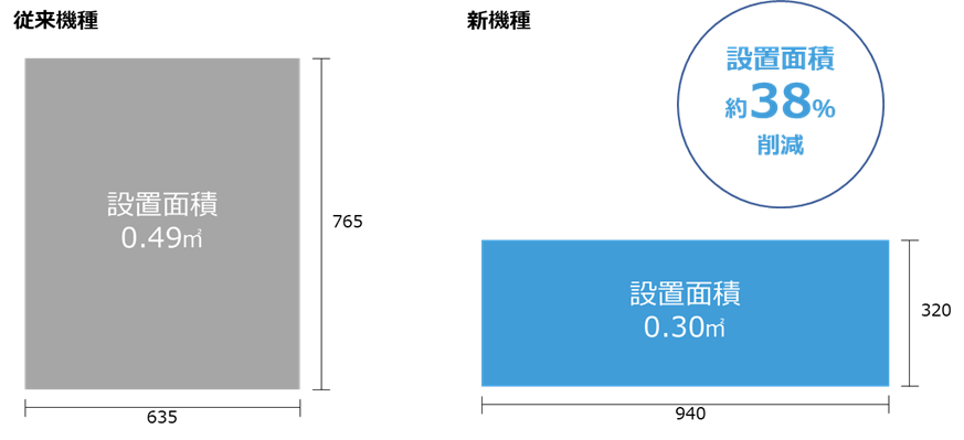 新型圧縮機を採用し、熱交換器を最適化することで設置面積を約38%削減しました
