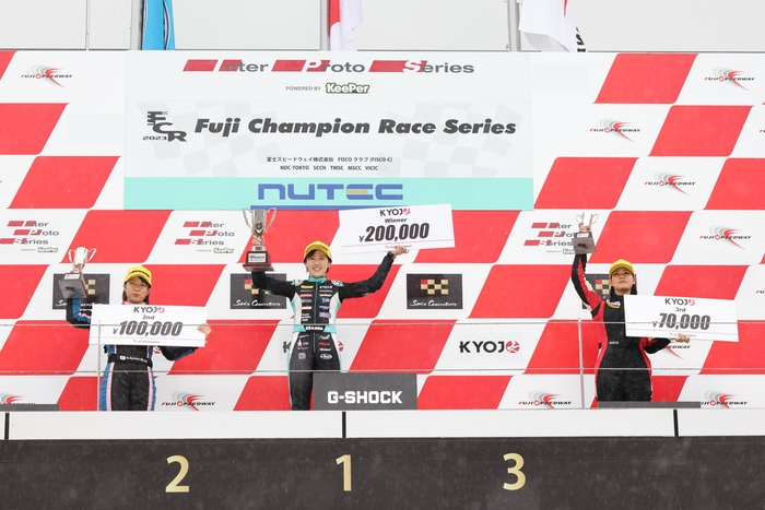 2位には#86 永井歩夢(Dr.DRY VITA)が入り、表彰台をかけた3位争いはゴールラインまで白熱。スピンから挽回した翁長が0.009秒差で#337 斎藤愛未(D.D.R VITA-01)に競り勝ち、3位表彰台を手にした。