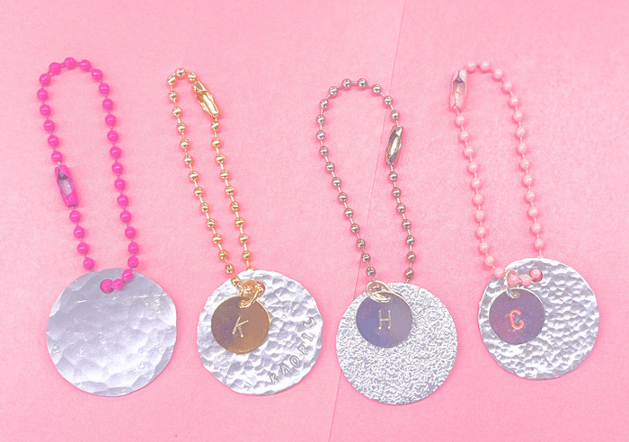 アルミ製のネームタグに、推しの名前や好きな文字・模様を刻印できるワークショップです。刻印した文字には色付けも可能で、さらにボールチェーンもお好みの色を選べます。アクセサリーにできるオプションもご用意しています。