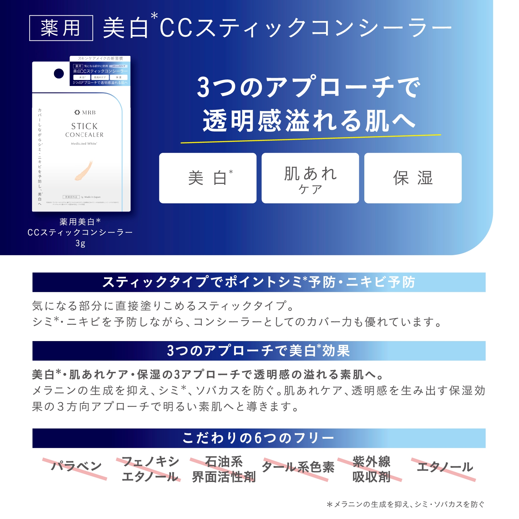MRB薬用 美白 スティックコンシーラーは、美白・肌あれケア・保湿の3つのアプローチで透明感の溢れる素肌にするスキンケア効果とメイクアップ効果による機能で美しい仕上がりを両立させたMRB独自のスティックコンシーラーです。