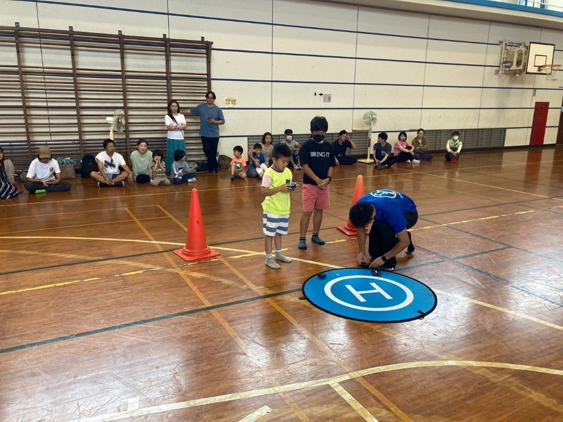 旧波浮小学校の体育館にて、大島町民に向けてドローン操縦体験会を行い、約40名の島民にご参加いただきました。