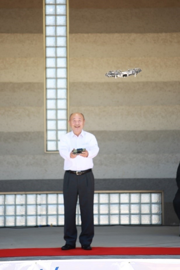 さらに、大島町長 坂上 長一様にドローン操縦を実際に体感して頂き、ステージ上で腕前をご披露頂きました。操縦前は緊張されながらも、実際に飛ばすと楽しそうに操縦されました。