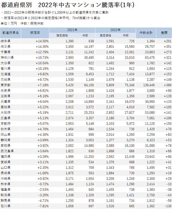 • 騰落率トップは、「岐阜県」の+14.50%。70㎡換算の推定価格は約200万円上昇した。次いで「埼玉県」、「千葉県」、「神奈川県」と首都圏が続いた。