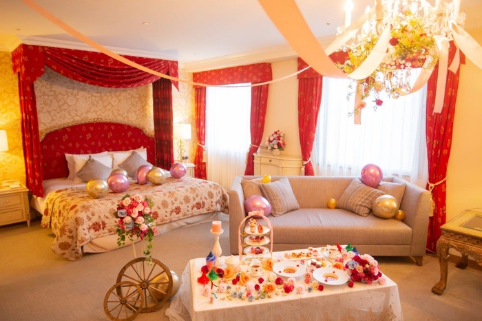 スイートルーム内はデコレーションを施し、民話“眠れる森の美女”の世界を表現。美しい薔薇のシャンデリアや薔薇のブーケ、手のひらサイズの糸巻など、写真撮影の際にご使用いただけるフォトアイテムも充実。物語にトリップした気分に浸っていただけます。