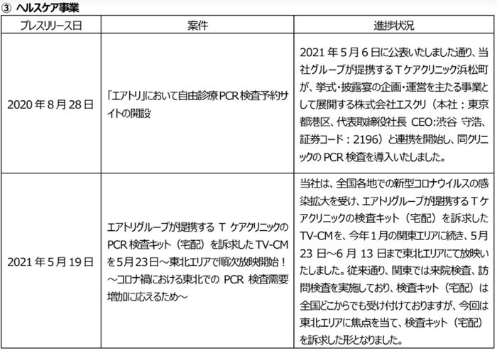 プレスリリース案件の進捗状況に関するご報告2021-06-14 17:00株式会社エアトリ当社はこれまでに発表いたしましたプレスリリースの各案件につき、6月1日時点において進捗がありました主な案件の状況について、以下の通りご報告いたします。■各案件の進捗状況https://www.airtrip.jp/画像・ファイル一覧一括ダウンロード