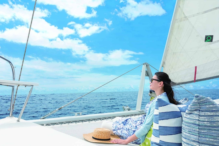 空港からほど近い港から海岸線沿いにある星のや沖縄まで、プライベートクルーズを楽しみながら向かいます。ハイシーズンの沖縄は、幹線道路の混雑が気になりますが海なら、混雑を気にすることなく移動中も快適です。到着後、いち早く向かう夏の海は、波も穏やかでクルーズを楽しむのに最適です。広い船内と安定感が高く、水面を滑るように走る双胴艇のカタマランボートで向かう約2時間の船旅では、波音に癒されながらアッパーデッキで寝転んだり、海からの風を全身で感じてリラックスしたり沖縄の海を満喫します。