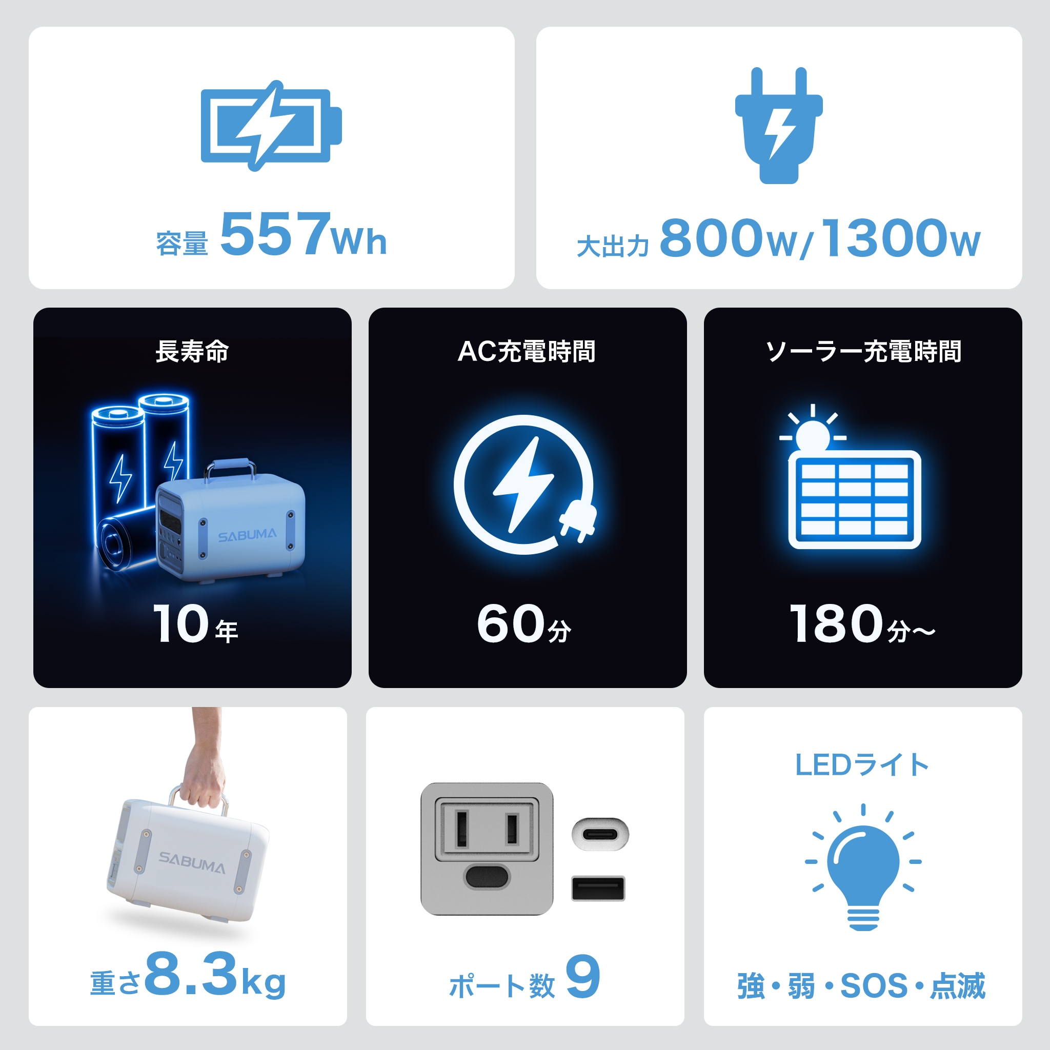 ・大容量 557Wh / 定格出力 800W(瞬間最大出力 1,300W)