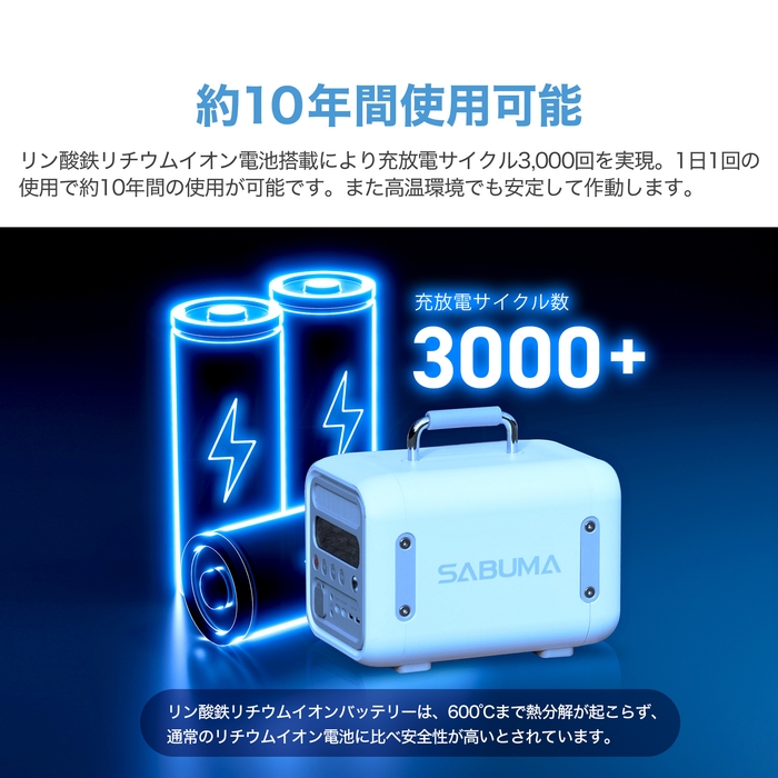 また、SABUMA史上最速の約1時間でフル充電ができ、リン酸鉄リチウムイオン電池を採用したため、充放電サイクルも3,000回と長寿命になっています。