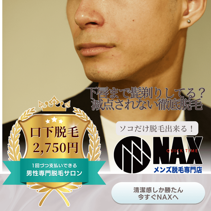 その為、『ソコだけ』脱毛したい方でも唇の下だけで脱毛メニューを選択することが可能です。他店で脱毛をしていてソコだけ毛が残ってしまっている場合は、メンズNAXで1部位2,750円(税込)でご対応!