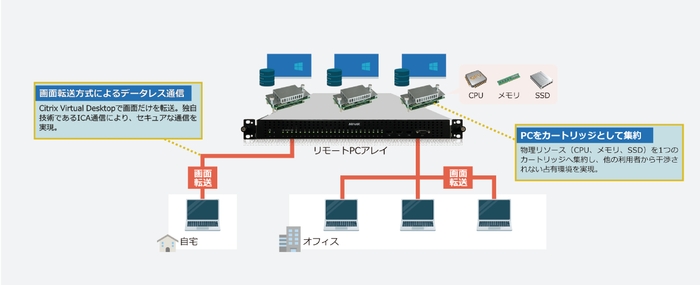 リモートPCアレイは、1Uの筐体に複数の物理PCカートリッジと仮想デスクトップに必要なコンポーネントを搭載したリモートアクセスソリューションです。初期コストや構築期間など、様々な仮想デスクトップ導入時の課題を解決すべく、20年以上の仮想デスクトップ販売、構築経験に基づき、自社企画製品として開発したのが「リモートPCアレイ」です。