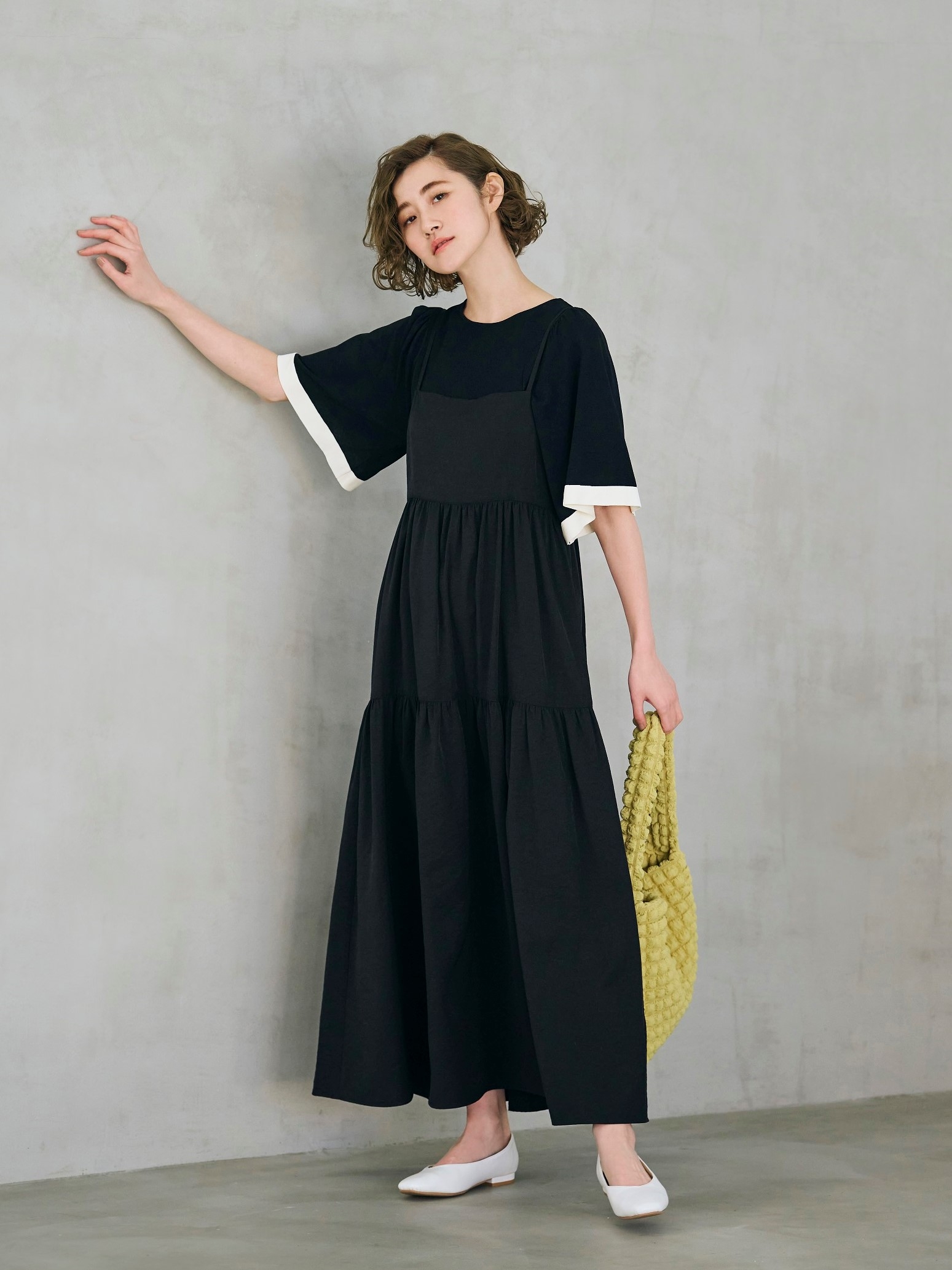 シンプルながら華やかさと体型カバーも叶う、マストハブな一枚です。