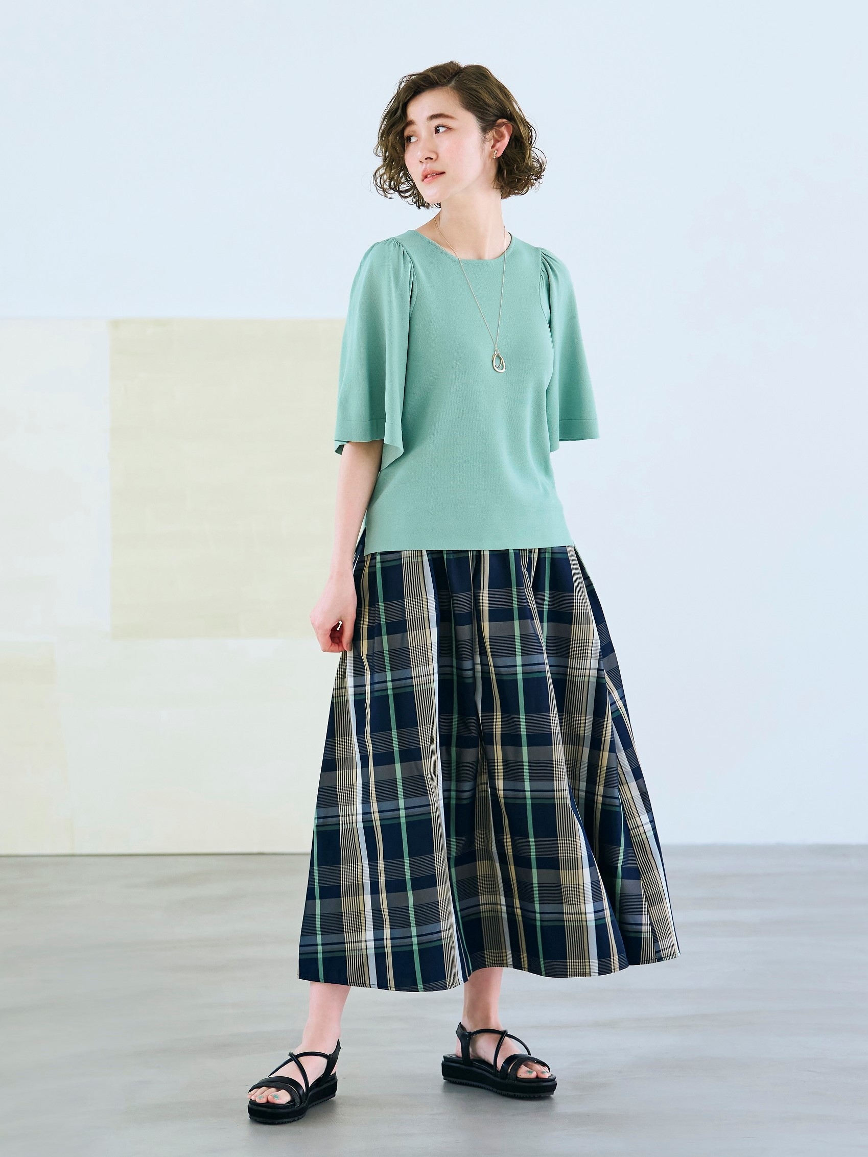 両脇にスリットが入れ前後差をつけている為、横からの姿もニュアンス感があり、二の腕をカバーするゆったりしたフレア袖でトレンドコーデを楽しんでいただけます。