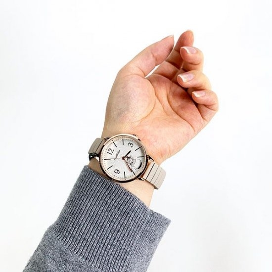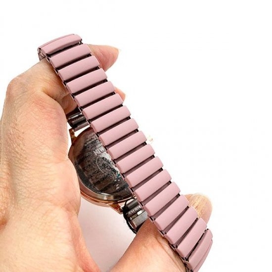 ポイントはこちら、伸縮性のあるカービングのジャバラベルトなので、少し伸ばしてそのまま腕にはめるだけなんです♪片手で付け外しするので、簡単に付けられるのは嬉しいですよね。優しいくすみピンクも、大人っぽさと可愛さが共存しています。