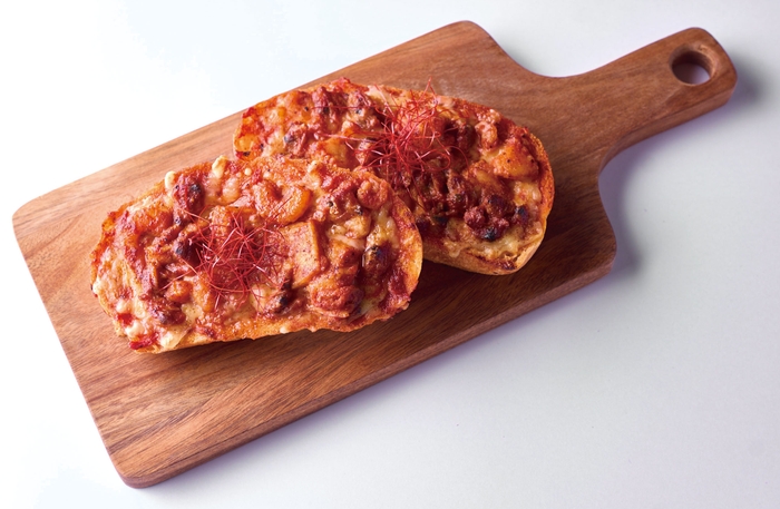 ザクザクうま辛チップ入りのバゲットにピリ辛マヨ明太がマッチ。上には糸唐辛子をトッピング。