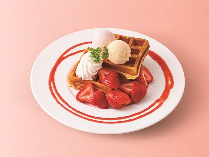 レモン風味のサクッとしたワッフルに、いちごとバニラアイス、甘さ控えめの生クリームを添えた一皿。