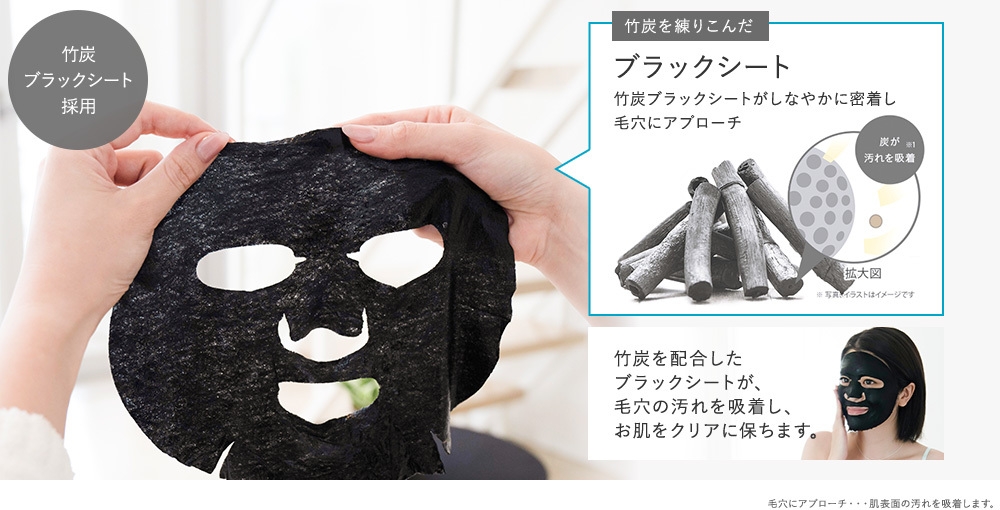(2)竹炭を練りこんだやわらかいブラックシートが、気になる毛穴の汚れを吸着※1し、お肌のキメを整えます。