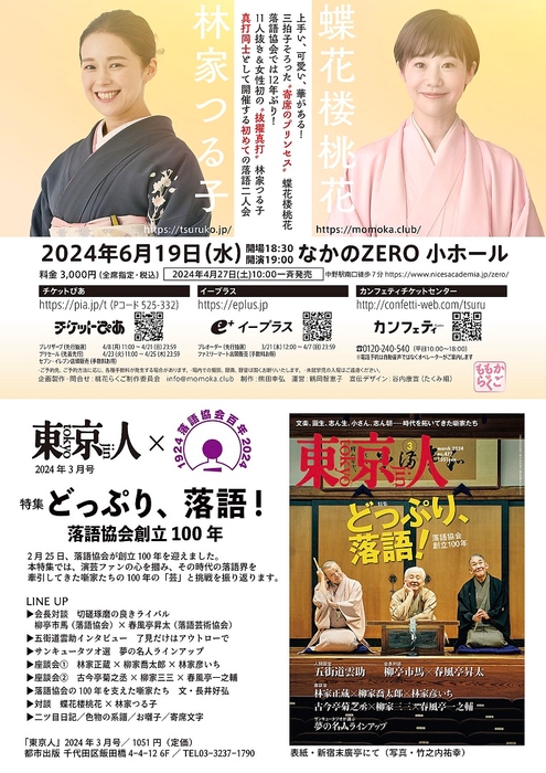 桃花らくご制作委員会主催、『蝶花楼桃花 林家つる子 二人会』が2024年6月19日 (水)になかのZERO 小ホール(東京都中野区中野2丁目9番7号)にて開催されます。チケットはカンフェティ(運営:ロングランプランニング株式会社、東京都新宿区、代表取締役:榑松 大剛)ほか各プレイガイドにて2024年4月27日(土) 10:00より予約受付開始です。