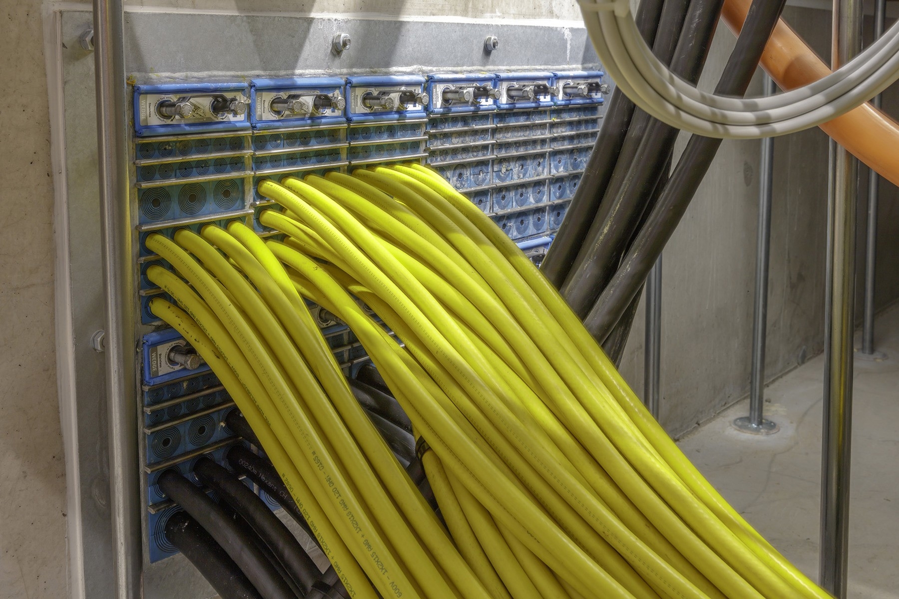 具体的には、Roxtec GH 貫通部が使用されています。 亜鉛メッキ加工を施した鋼製貫通部フレームは、コンクリート壁にボルトで固定され、Roxtec シーリングモジュールで埋められました。このゴム製モジュールには Roxtec が開発した Multidiameter™ という技術が採用され、剥がせるレイヤー構造になっているので、さまざまに異なる外径のケーブルやパイプに簡単に適応します。
