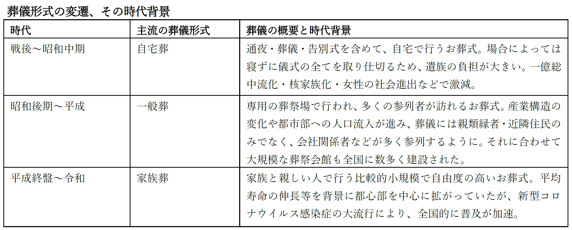 葬儀の形はその時々の世相や家族のあり方を映しながら、進化を続けています。戦後主流であった自宅葬は一般葬に置き換わり、現在は家族葬へのシフトが進み、コロナ禍において家族葬へのニーズはさらに高まっています。(下表参照)