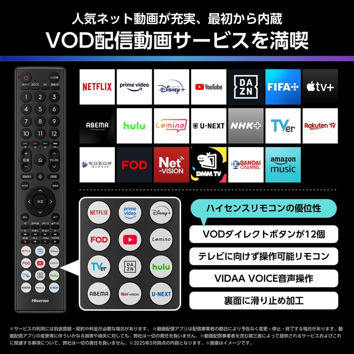 - 人気のネット動画対応のVIDAA OS搭載、12社の選択が手間なくできるVODダイレクトボタン